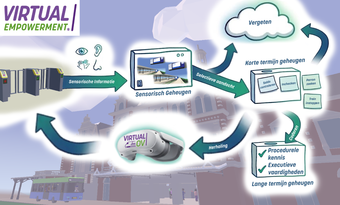 In onze 6DoF VR-omgeving (Six Directions of Freedom, ofwel: vrij bewegen in alle richtingen) geven we hier direct invulling aan. Deelnemers staan niet naast de situatie, maar er middenin: op een station, in een tram of in een drukke winkelstraat. Ze kijken rond, horen omroepberichten, lopen naar een toegangspoortje en steken hun hand uit om in te checken. Alle zintuigen doen mee. Zo landt informatie eerst stevig in het sensorisch- en kortetermijngeheugen en wordt vervolgens – door herhaling en feedback – gecodeerd naar het langetermijn- en procedurele geheugen. Losse instructies worden zo stap voor stap omgezet in routines.